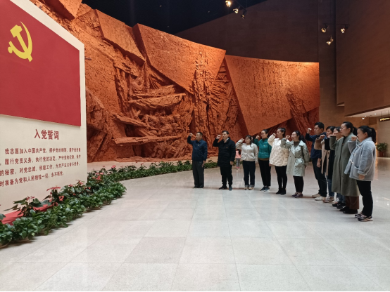 在纪念馆中,大家在讲解员的带领下,依次参观了战前形势、战役准备、突破江防、战役胜利、人民支前和英烈业绩六大展厅,瞻仰了渡江战役烈士名录,感受革命先烈为了中国人民的解放事业不怕牺牲,奋勇杀敌的英雄气概,深切缅怀革命先烈的丰功伟绩。在“胜利之师”雕像前,党员们在党支部书记的带领下,面对庄严的党旗,重温入党誓词,进一步增强党性观念,强化党员意识,凝聚战斗精神。