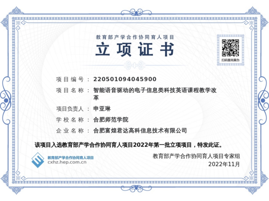 本网讯 2022年11月1日,教育部高等教育司下达了关于公布2022年第一批产学合作协同育人项目立项名单的通知,ok138cn太阳集团申亚琳老师主持的“智能语音驱动的电子信息类科技英语课程教学改革”项目获批立项。这也是我院首次获得教育部产学合作协同育人的项目。
