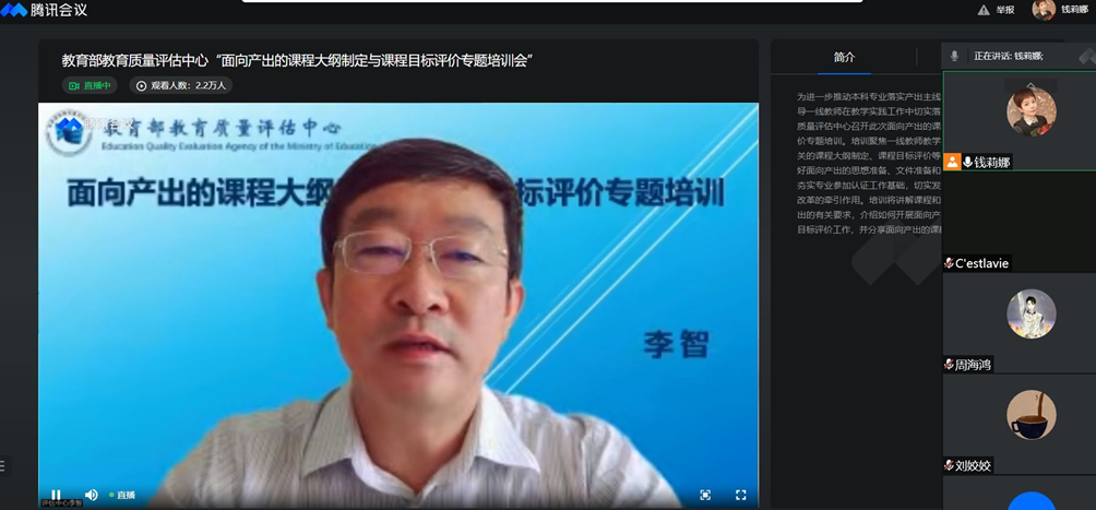 钱老师向与会教师介绍了本次培训的主题与培训目标,培训结合教育部教育质量评估中心召开的“面向产出的课程大纲制定与课程目标评价专题培训”开展,各位教师可以在培训中对课程大纲和课程目标的修订思路更加清晰,也可以将培训要点融合到课程建设中去,对认证工作理念的理解更加透彻,落实更加有力。