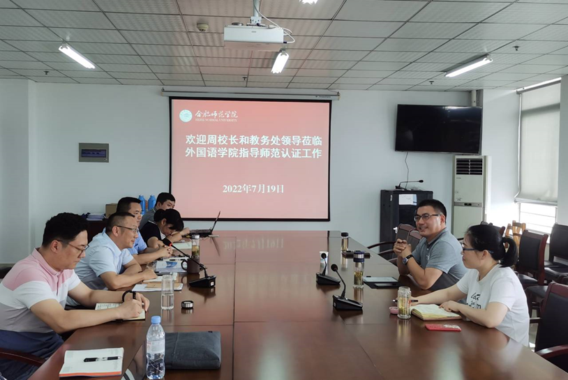 为进一步推进英语师范专业认证工作顺利开展,2022年7月19日上午,校党委委员、副院长周端明、教务处副处长董萍一行人到ok138cn太阳集团调研指导英语师范专业认证工作。调研指导会在行知楼1002会议室举行,ok138cn太阳集团党政领导班子、英语系师范认证相关教师参加了会议。