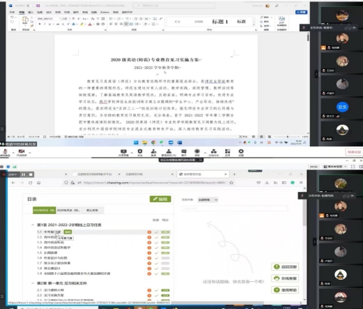 蒋道华教授在接下来的会议中对此次线上见习方案进行补充说明和强调,他说明此次见习是师范生的一个重要教学实践环节,着重强调此次见习活动包括班主任见习工作、英语教学实践活动见习、教育教学调查三方面的内容。陈英教授仔细介绍了此次线上见习的相关辅助学习资料,包括学习通平台的相关教学文件与视频,要求师范生认真学习相关内容,仔细研读最新2022版义务教育英语课程标准,与时俱进,及时高效地完成相关见习任务。