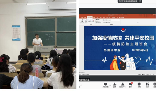 辅导员们根据不同年级学生的实际情况,采取线上线下相结合的方式开展主题班会,积极引导学生真正从思想上和行动上做好自我防护。周贵勤围绕疫情防控安全、春季传染病安全、交通安全、人身财产安全、就业安全等五大方面安全内容展开具体介绍,提醒学生疫情期间要加强自我防护,警惕招聘环节中存在的“陷阱”,切实提高安全意识。朱儒进分析了当前疫情防控形势,详细说明校园疫情防控政策,并要求各位同学要自觉遵守防控要求,保护好自身安全。