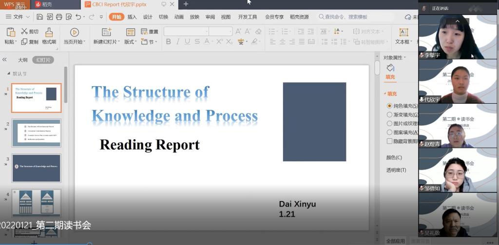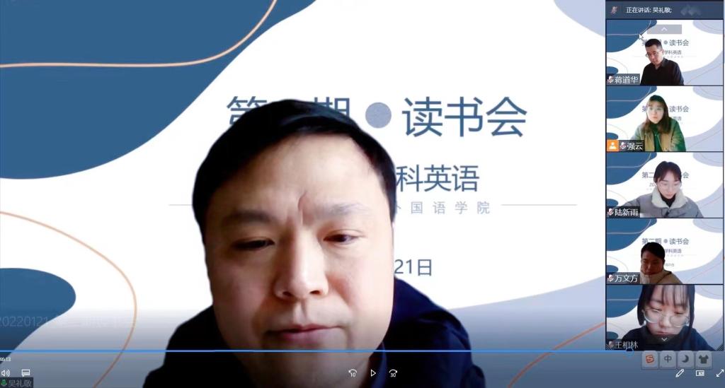 本网讯 为了强化研究生过程性培养,推动研究生专业知识与能力的不断提升,在外院研究生部的统筹下,外院部分导师组成硕士生培养共同体小组,推进硕士生读书研讨活动的开展。2022年1月21日上午9时,我院21级硕士班开展了第二次线上读书研讨会活动(寒假),部分21级教育硕士生参与该研讨会。本次读书研讨会由陆新雨、代欣宇两位同学作主旨汇报,研究生部主任蒋道华、研究生导师强云、吴礼敬指导并参与了本次研讨。