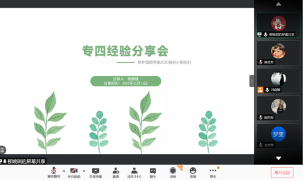 本次会议邀请了2019级英语师范专业凃玮琳等四名同学作经验分享,会上,大家主要围绕考试时间、考试题型、书目推荐以及备考历程等四大方面展开介绍。商务专业的柳婉琪同学就英语专四考试的题型设置和时间安排进行详细说明,英语(师范)专业的凃玮琳同学则结合自身备考经验,为大家逐个介绍各模块的复习方法和注意事项。西班牙语专业的朱露露、方祁铖同学总结概括了西语专四考试中的重难点,并主动分享学习资料,鼓励学弟学妹们调整心态,沉着应对。