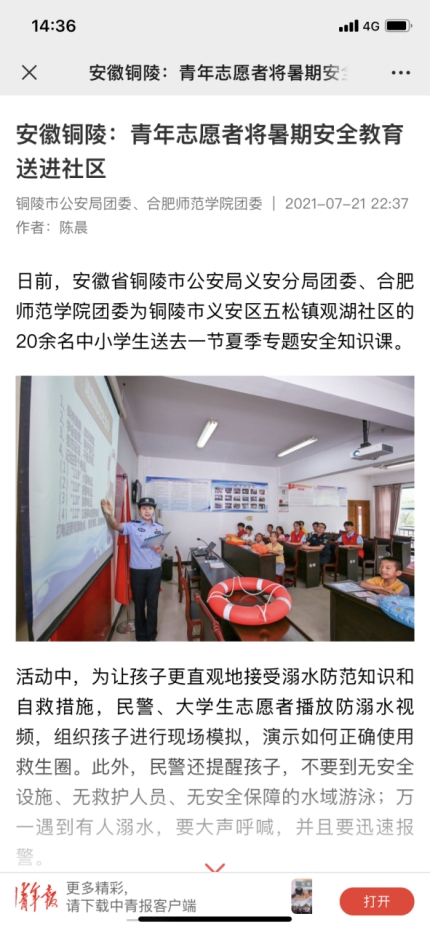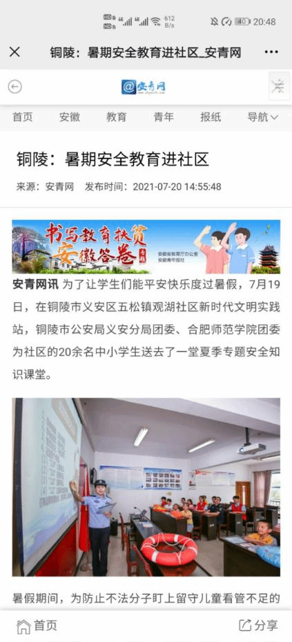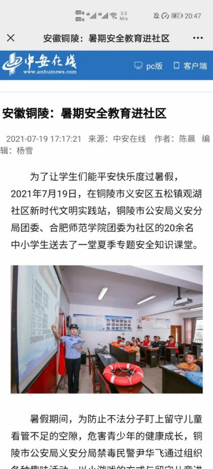 7月19日,中安在线,安青网对博雅行知学堂开展的夏季专题防溺水课程进行了报道。