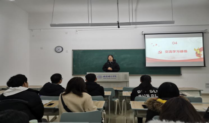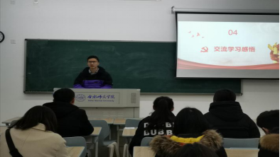 在交流学习感悟环节中,同学们纷纷结合自身学习经历,分享自己的切身体会。19级商务英语2班的柳婉琪说:“习近平总书记提出要不忘初心,继续前进。作为入党积极分子,我们应该深刻理解这句话的含义。作为班级的骨干力量,“四史”的学习应该由我们带头进行,我们要充分发挥模范带头作用,以身作则,积极并且自愿地去学习“四史”,努力提升自己的政治意识,从而更好的完成各项工作。”