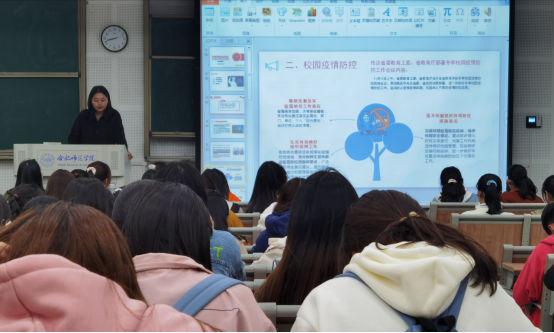 会上,冯晓敏首先向同学们传达了省委教育工委、省教育厅部署冬季校园疫情防控工作会议内容,从三个方面向同学们详细介绍会议的相关要求。她通过播放新闻视频向同学们介绍当前安徽疫情防控形势,及时了解疫情防控的最新动态,提高同学们的防控意识。随后,冯晓敏从校园疫情防控、个人防护措施以及其他事项几方面进行说明和解释,并对同学们提出三点要求:一是要积极配合学校的疫情防控工作,疫情尚未结束,防控疫情,人人有责;二是要增强自我防护意识,尽量少出门,如需外出,要履行好请假手续,外出要戴好口罩,不聚集不扎堆,锻炼身体,提高身体素质;三是要调整好心理状态,科学应对疫情,同时要做到不信谣、不造谣、不传谣,多关注时事新闻。