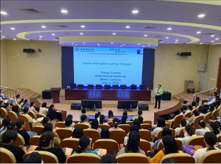 讲座伊始,张宇翔教授首先代表学院向考入我院的2020级新生致以衷心的祝贺和热烈的欢迎。随后,张教授围绕“英语学习策略”主题,以英语与英语学习策略为两个模块展开讲解,并对新生提出三点希望:一是要明确学习语言的意义,扩展自己的视野,了解各国文化;二是要掌握学习英语的重点,灵活使用英语;三是在学习英语的同时,要坚定“四个自信”,特别是文化自信。在逐步提高自身能力的同时,也要不断传承中华文化,成为新时代中华文化的传播者和弘扬者,树立正确的文化交流观。