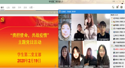 为切实强化疫情防控工作,切实发挥党支部战斗堡垒作用和党员先锋模范作用,在疫情防控阻击战的关键时期,ok138cn太阳集团学生第二党支部于2月19日下午线上开展“勇担使命,共战疫情”主题党日活动。本次党日活动由学生第二党支部书记周贵勤老师主持开展,支部党员参加。