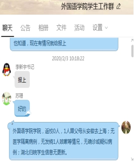三、坚持全过程,全程联系动态掌握师生每日信息。疫情防控工作开展以来,ok138cn太阳集团要求全体学生管理队伍守岗履责,采取线上模式,坚持人盯人工作方式,全天候24小时在线,全程摸排,动态掌握学生信息情况。特别是那些到访过重点疫情防控地区、与重点疫情防控地区人员或确诊病例有接触史的学生,询问他们的每日状况,安抚他们的焦虑和紧张情绪,提醒他们做好居家隔离,异常情况必须第一时间上报。要求全体教师扛实教书育人责任,充分做好线上教学各项准备工作。