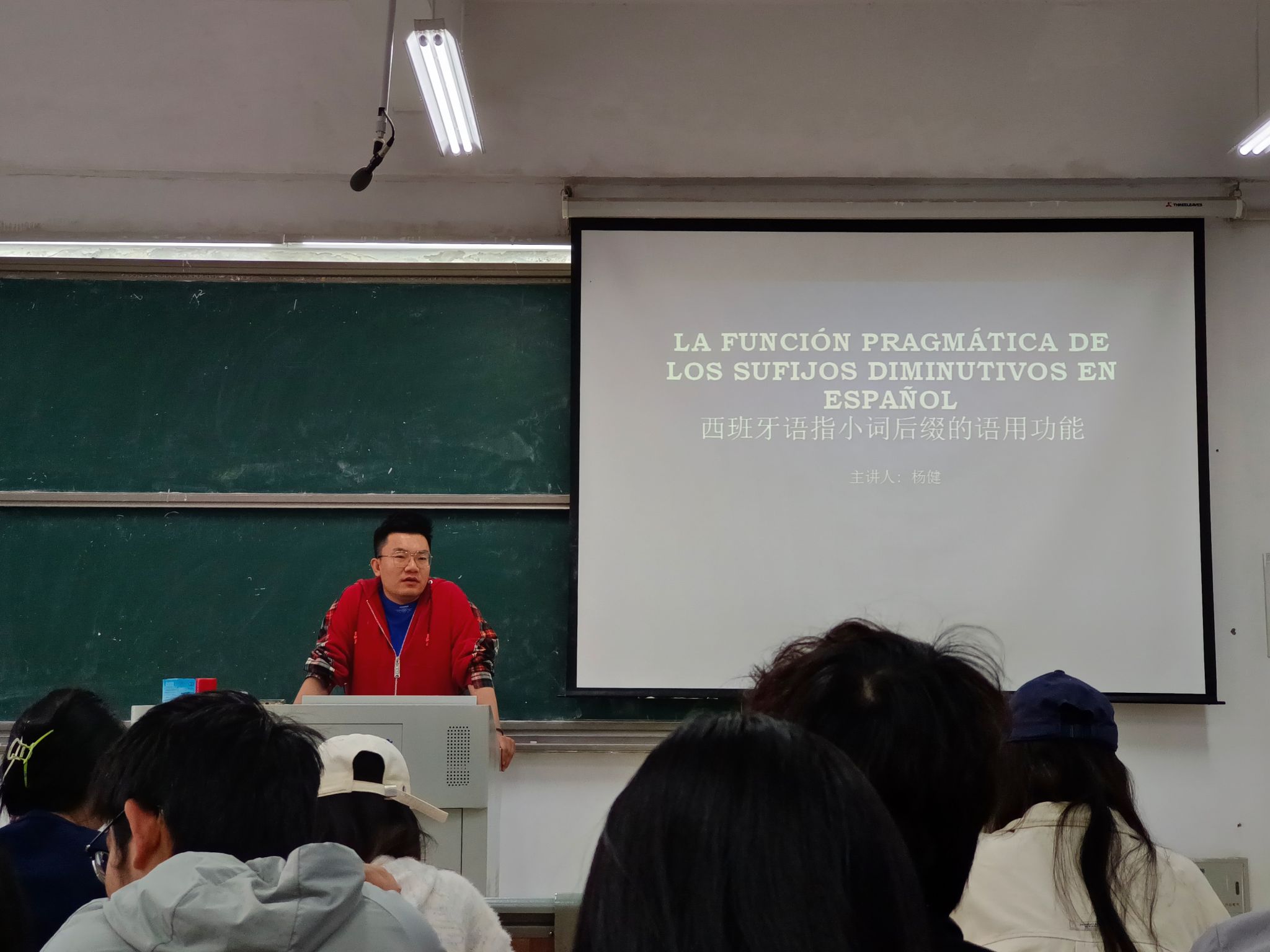 2025年4月16日下午,ok138cn太阳集团西班牙语专业杨健博士在博学楼A206教室,作了《西班牙语指小词后缀的语用功能》学术报告。2023级与2024级西班牙语专业学生听取了此次报告。