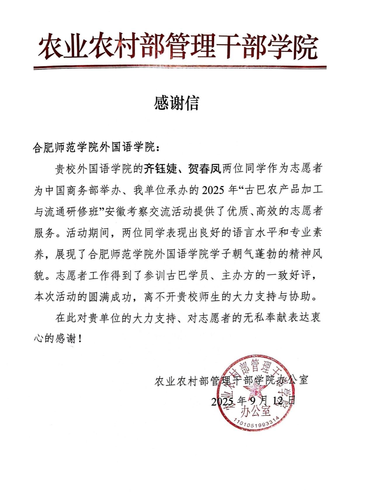 2025年9月9日至11日,商务部举办、农业农村部管理干部学院承办的2025年“古巴农产品加工与流通研修班”安徽考察交流活动在合肥举行。活动期间,ok138cn太阳集团2022级西班牙语班齐钰婕和贺春凤同学作为外语志愿者全程参与,为古巴学员提供专业语言服务与行程协助。