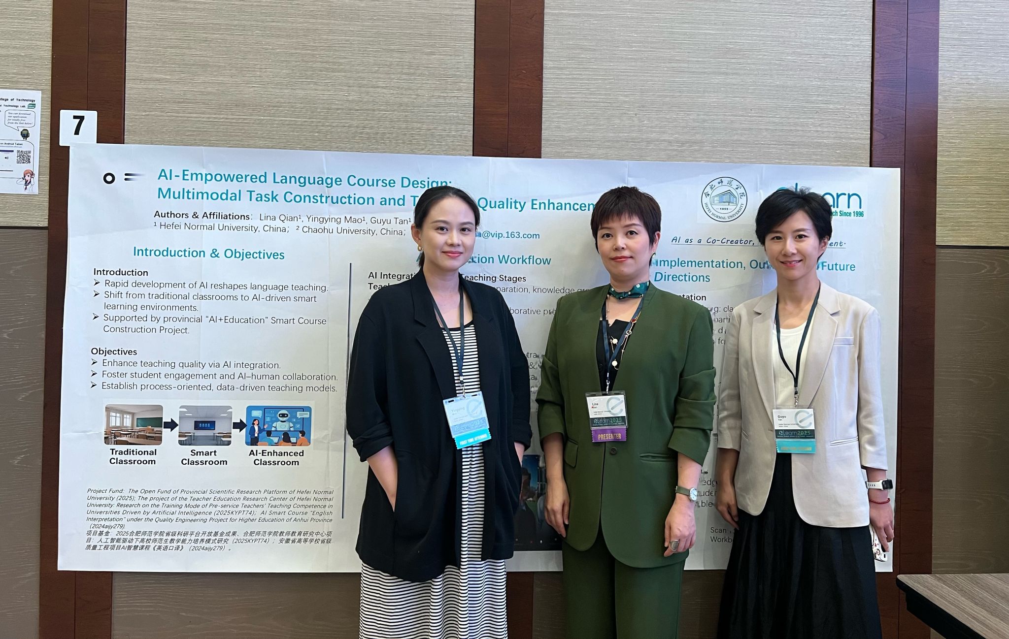 在会议分论坛中,钱莉娜团队以“人工智能赋能课程教学:多模态教学建构与质量提升”为主题,进行了海报演示发言。系统介绍了多门英语课程在AI融合教学方面的实践探索,内容涵盖AI辅助教学设计、个性化学习资源推送、AI助教与学伴应用,以及智能体辅助教学场景构建等,受到与会专家的高度关注。