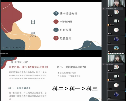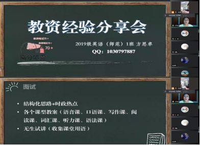 本次会议,学院邀请了三名优秀学生代表通过线上会议的方式为同学们讲述自身备考经历,分享考试经验。2019级英语(师范)专业的方思卓主要围绕教资考试概况、备考攻略、宝藏单品等三大内容展开介绍,结合自身实战经历分享不同科目的备考难点和重点。2019级商务英语专业的王端主要从科目介绍、时间安排、经验总结几方面进行详细介绍,提醒同学们要合理安排备考时间和各科目的侧重点,备考做到有计划、讲重点,讲方法。