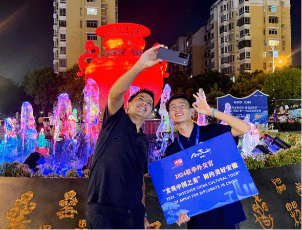 9月8日晚,2024驻华外交官“发现中国之美·相约美好安徽”活动来到合肥国家级旅游休闲街区罍街,学生志愿者们带各国外交官们游览街区美景,感受文化底蕴。